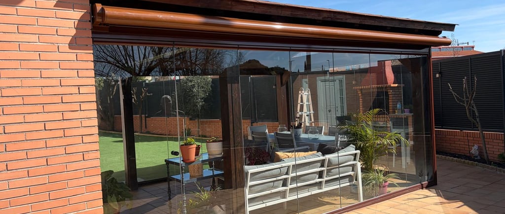 Cerramiento de aluminio con cortinas de cristal y toldos cofre extensibles para disfrutar del espacio todo el año.