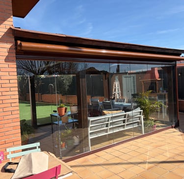 CERRAMIENTO DE ALUMINIO CON CORTINAS DE CRISTAL Y TOLDOS EXTENSIBLES